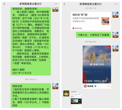 节目播出当天,党总支在公司党员群转发了公司关于做好此项工作的通知要求和陕西先锋公众号文章《精彩抢“鲜”看!》,督促各党支部按要求及时上传学习情况,提醒广大党员及时收看节目。直播开始后,在群里转发直播公众号,方便大家收看。