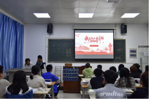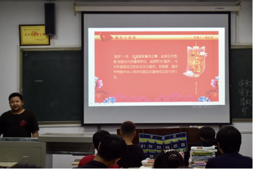 各班团支书组织同学们学习了国庆的由来。为同学们讲述革命先辈们的故事,“以青春之我,创建青春之国家,资以乐其无涯之生。”“蓝灰色,八角形,五星搁中央,主义放心上。”“我们革命有希望了,我们有地方去了,走,我们去陕北!”一个个鲜活的事例,一句句坚定的话语,让同学们回到了那个年代,感受着那份信念,涤荡着青春的心灵。生动的语言、经典的音像资料让同学们深切体会到了“没有共产党就没有新中国”,勉励同学们树立共产主义远大理想,在思想上先入党,在行动上热心服务集体,刻苦学习本领,报效伟大祖国。