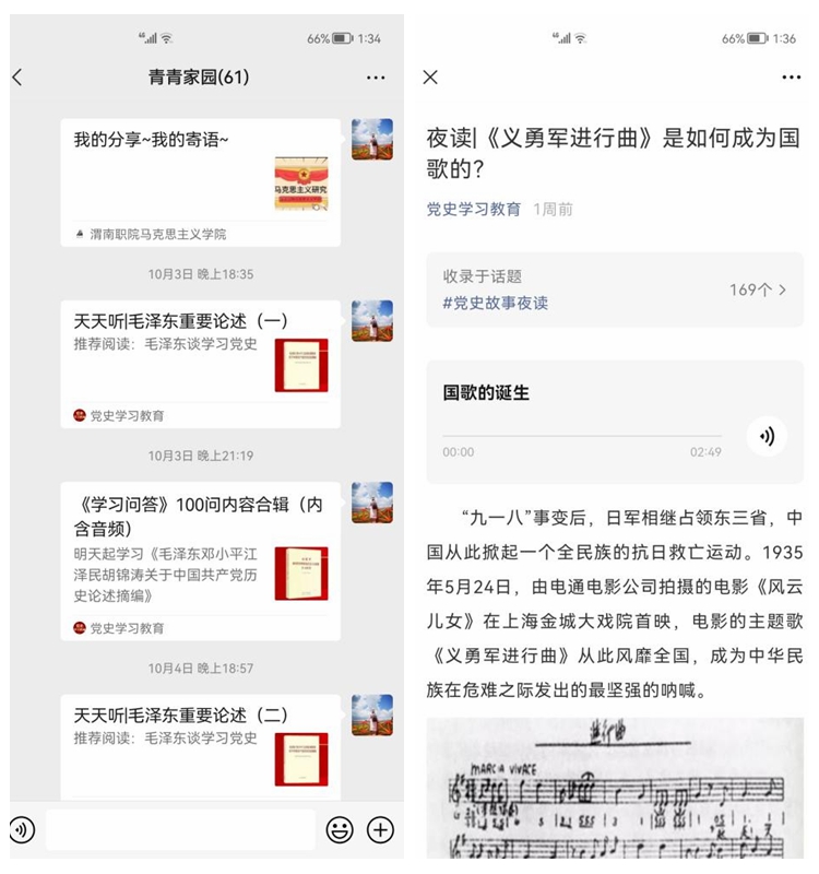 在党员干部中,把认真学习贯彻习近平总书记“七一”重要讲话和来陕考察重要讲话精神作为首要政治任务,鼓励他们学史力行,在服务师生做好事做实事上作表率。在员工中,扎实开展党史学习教育和形势政策教育,引导青年员工坚定理想信念,在学好党史践悟思想上当先锋,在砥砺奋斗成才报国上勇担当,传承红色基因,书写华彩青春!一是继承先烈遗志,传承信仰的力量。广大师生利用手机、电脑等重温9月30日上午在北京天安门广场隆重举行的烈士纪念日向人民英雄敬献花篮仪式。英烈们用鲜血浇灌理想,用生命践行使命,用奉献书写人生,在中华民族的历史长河中构筑起一座座不朽的精神丰碑。广大师生表示,要学习英烈身上的爱国精神、奋斗精神、奉献精神,砥砺奋进、奋发作为,为现中华民族伟大复兴中国梦贡献自己的智慧和力量。二是假期党史学习教育不断线。党总支在威廉体育williamhill党员和教工“青青家园”群推送由党史学习教育领导小组办公室指导,人民网.中国共产党新闻网承办的“党史学习教育”公众号文章《中华人民共和国简史》导读及“天天听 毛泽东重要论述”共6期。三是个人自学不放松。党员干部和员工利用“学习强国”学习平台、“渭南互联网+党建云平台” “渭南职院”、渭南职院“团委”、“马院”等公众号进行党史学习。