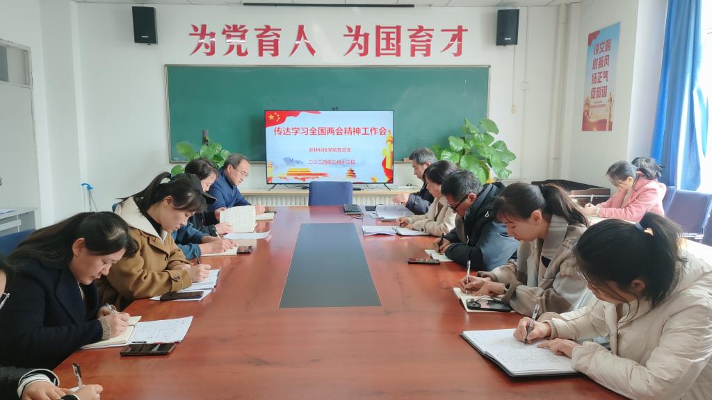 会议要求,广大党员干部、教职工要切实把思想和行动统一到全国两会精神上来,以实际行动落实好“弘扬教育家精神,建设高素质专业化教师队伍”的具体要求,自觉领悟教师的崇高使命,增强做好职业教育的责任感和使命感,在躬耕教育、行为世范中成就自我;在乐教爱生、智慧育人中成就他人;在心有大我、弘道天下中成就世界。