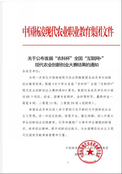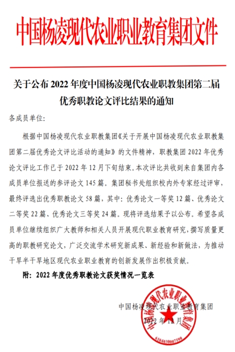 近日,由中国杨凌现代职业农业教育集团举办的2022年度中国杨凌现代农业职教集团第二届优秀职教论文评比和首届“农科杯”全国“互联网+”现代农业创新创业大赛圆满落下帷幕。经多个环节评选,公司威廉体育williamhill在2个赛项中荣获一等奖1项,二等奖1项,三等奖2项。